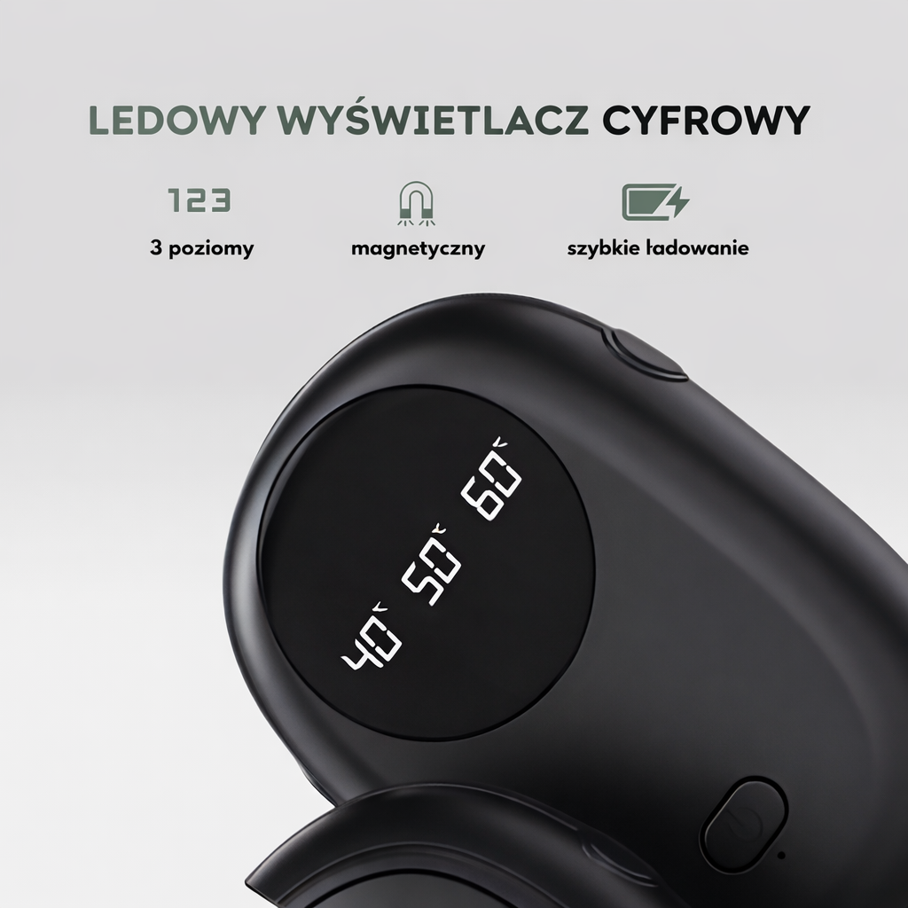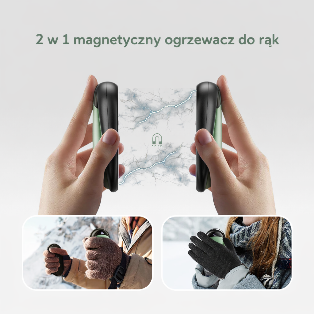 Magnetyczna konstrukcja 2-w-1 – Połącz oba elementy dla większej mocy cieplnej lub używaj osobno dla jednej dłoni. Praktyczne i elastyczne rozwiązanie.